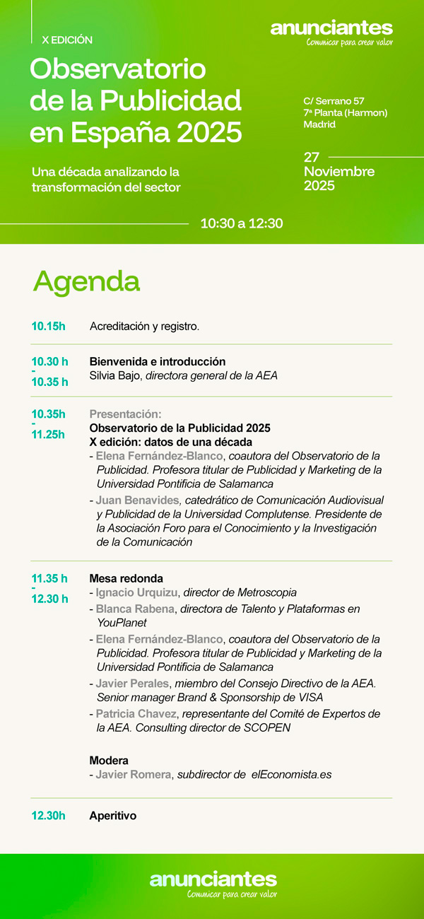 El próximo 27 de noviembre, de 10.30 a 12.30h, además de presentar a los medios los datos del Observatorio de la Publicidad 2025, también analizaremos una década de evolución de los principales datos económicos de este mercado, así como las tendencias más cualitativas por las que transcurre la comunicación comercial.
