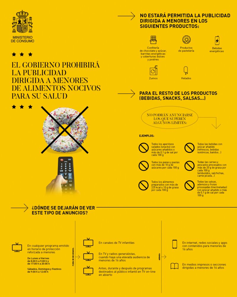 El día 28 de octubre, el Ministerio de Consumo hizo pública su intención de prohibir la publicidad, dirigida a menores de 16 años, de helados, zumos, bebidas energéticas, productos de pastelería, confitería de chocolate y azúcar, barritas energéticas y coberturas dulces y postres.